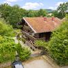 Der natürlich eingewachsene Garten ist durch einen Zaun abgegrenzt und in verschiedene Bereiche unterteilt. Eine Remise, mehrere Terrassen und Sitzplätze, ein abgetrennter Bauerngarten, eine Feuerstelle und viele nette Orte machen das Grundstück zu einer kleinen Oase. Das Grundstück fällt leicht nach Westen hin ab und wird dann dort von einem Bach begrenzt.