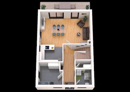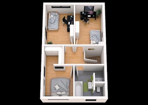 Eine elegante und moderne Hausarchitektur kombiniert mit einer optimalen Grundrissgestaltung zeichnen die Qualität der Doppelhaushälfte aus. Durch die 2-geschossige Bauweise ergibt sich im Obergeschoss wesentlich mehr Stell- und Bewegungsfläche und die Räume sind durch große Fensterelemente ebenfalls hell und freundlich. Der Grundriss sieht im Erdgeschoss einen geräumigen Wohn-/ und Essbereich vor, der mit einer offenen Küchenplanung ausgeführt ist. Der gesamte Wohnbereich ist hell und lichtdurchflutet. Eine 2-flügelige Terrassentür und zwei weitere bodentiefe Fensterelemente sorgen dafür. Direkt gegenüber der Küche ist ein praktischer Abstellraum gelegen, der zusätzlich auch den Platz unterhalb der Treppe optimal ausnutzt. Ein Gäste-WC, eine Diele mit Treppenhaus und ein Hauswirtschafts-/Haustechnikraum komplettieren das Erdgeschoss. Im Obergeschoss befinden sich zwei Kinderzimmer und ein Elternschlafzimmer mit Ankleide. Das familienfreundliche Bad ist mit einer Badewanne, einer Toilette, einem Waschtisch und einer modernen Trennwandlösung sowie einer bodengleichen Dusche ausgestattet.