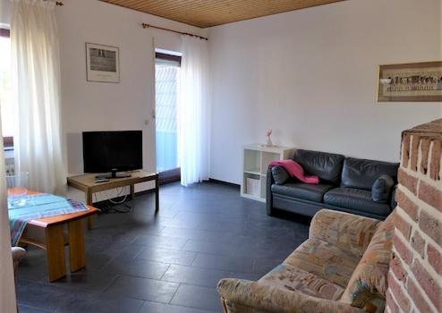 Das Wohnzimmer mit dem Essplatz und Balkon bietet Raum zum Verweilen.