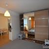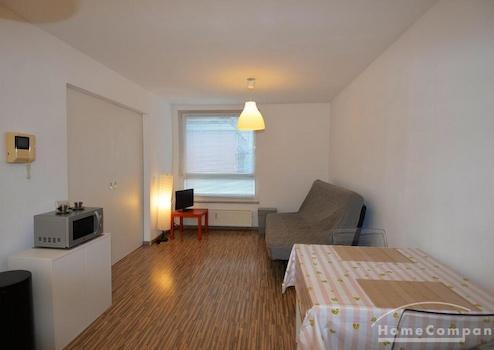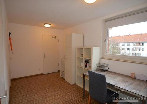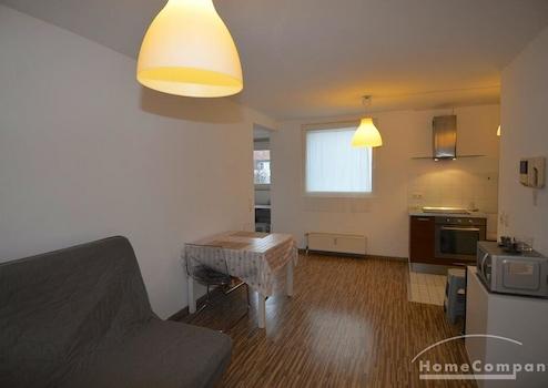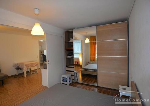 Moderne Zwei-Raum-Wohnung in Prenzlauer Berg, Seitenstraße Nähe S-Bahnhof Greifswalder Straße (Ringbahn). Die sonnige Wohnung hat neue Laminatböden, ein gemütliches Schlafzimmer mit zwei Kleiderschränken und Doppelbett, ein großes Wohnzimmer mit Schlafsofa und tollem Blick zum Innenhof sowie eine offene, komplett ausgestattete Einbauküche (Wasserkocher, Toaster). Bettwäsche und Handtücher sind vorhanden. Es gibt einen großzügigen Vorraum mit mit Schreibtisch und eine praktische Abstellkammer. In dem Gebäude gibt es zwei Aufzüge.