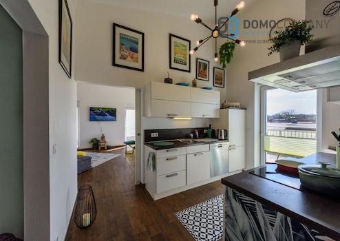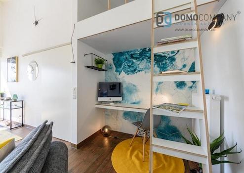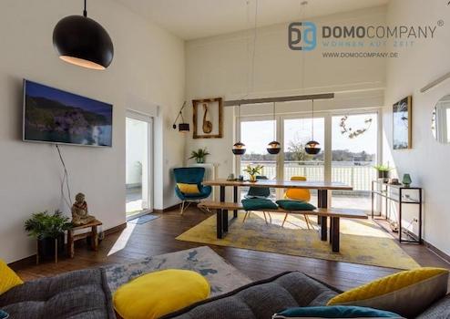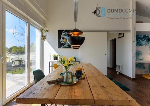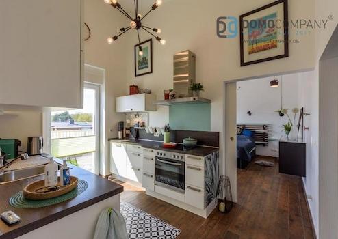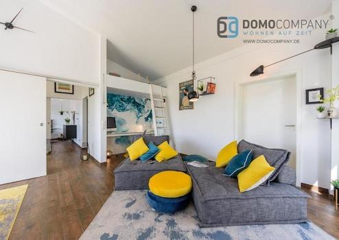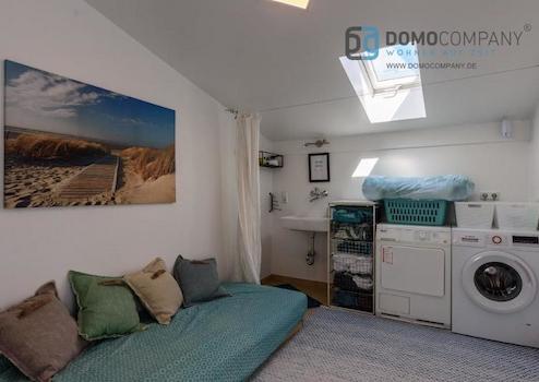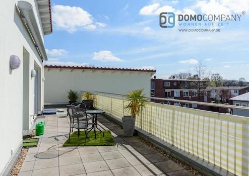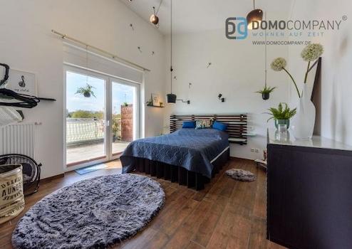 2-ZKB, Bett gross o. Dop., Designboden, Dusche/WC, Einbauküche, Internet, Küche, Kühl-/Gefrierkombi, offene Küche, TV, Wäschetrockner, Waschmaschine, Zentralheizung, Appartmenthaus, Keine Tiere, möbliert, Nur für Nichtraucher, Parterre, PKW-Stellplatz, Dachgeschoß