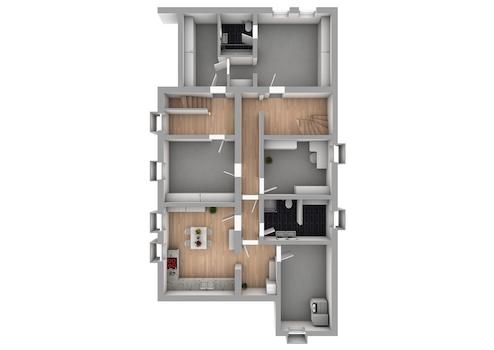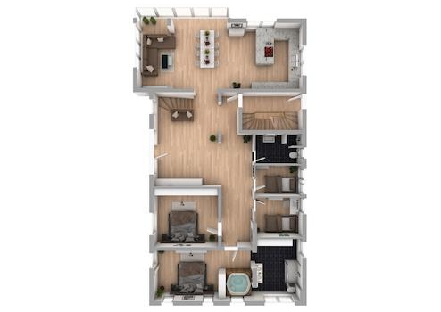Sowohl die 2-Zimmer- als auch die 3-Zimmer-Wohnung befinden sich im Obergeschoss, haben separat zugängliche Küchen samt Einbauküchen, neue Bäder und ein neu abgeschliffenes Parkett (2021). Die kleine Einheit hat ein Balkon.