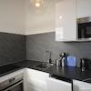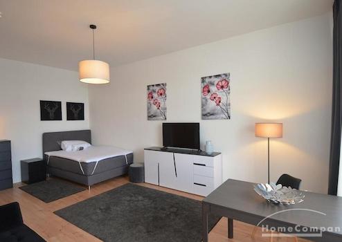 Ein-Zimmer-Wohnung in Mitte. Vollständig möbliert mit Bett, Tisch und Waschmaschine. Modern gefliestes Badezimmer mit Dusche. Im Flur befindet sich der Kleiderschrank.