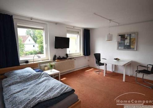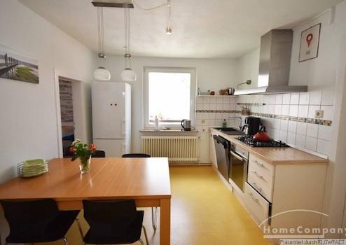 Das Zentrum dieser Wohnung ist die großzügige Wohnküche, die voll ausgestattet ist. Der Tisch bietet 4 Personen Platz zum gemeinsammen Essen. Neben an befindet sich ein kleiner Abstellraum. Im Badezimmer mit Dusche und Fenstern befindet sich auch die Waschmaschine. Das Schlafzimmer ist mit Doppelbett und einem Kleiderschrank ausgestattet. Das zweite Zimmer ist eine Kombination zum Wohnen und Schlafen. Ein begehbarer Schrank ist über Tür zu erreichen. Somit ist die Wohnung auch für 2 Kollegen geeignet. Bei einer Belegung von 2 Personen erhöht sich die Miete um 100,00€.