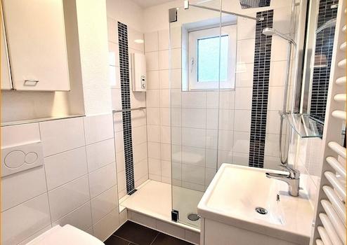 Das Highlight ist das 2019 neu gestaltete Duschbad mit moderner Fliesung und Fenster. Hier beginnt der Morgen in angenehmer Umgebung.