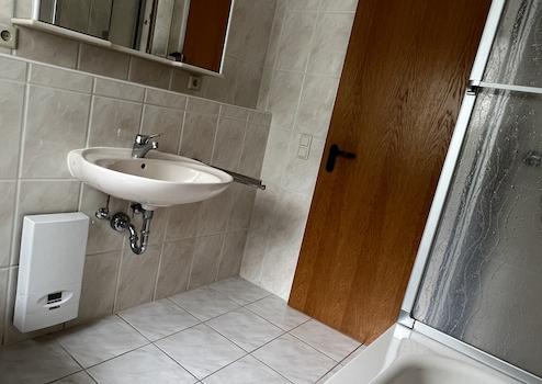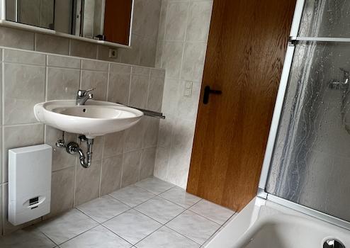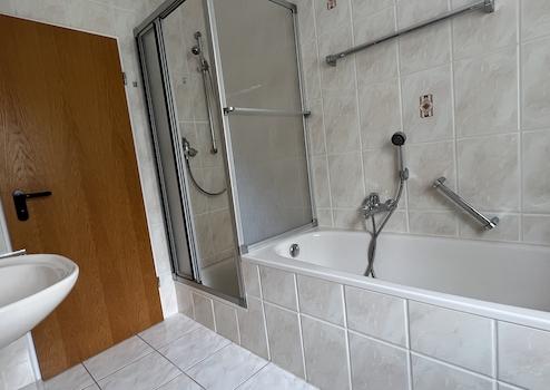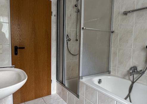 Gegenüber vom Eingang befindet sich das zeitlos ausgestattete Badezimmer mit Dusche, Badewanne und Tageslichtfenster.