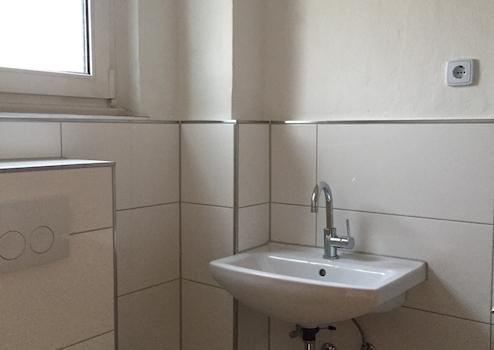 Links befindet sich ein neu gestaltetes Dusche WC mit ebenerdiger Dusche.