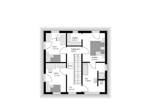 WC kann optional auch als Duschbad ausgebaut werden. Im Obergeschoss des Hausentwurfes befinden sich zwei nahezu gleich große Kinderzimmer, ein geräumiges Familienbad und der Elternschlafbereich mit Ankleide und direktem Zugang zum Bad. Die Nettoraumfläche beträgt 125 m².