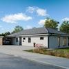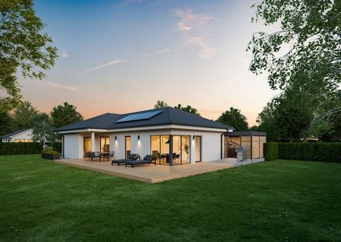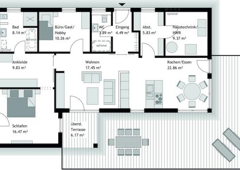 Der Winkelbungalow mit Walmdach bietet auf 40,31 m² einen offenen Wohn-/Ess- und Kochbereich, der äußerst gut strukturiert ist. Durch eine halbhohe oder auf Anfrage raumhohe Wand kann der Koch- und Essbereich vom Wohnbereich abgetrennt werden, was eine flexible Nutzung ermöglicht. Große Terrassentüren sorgen für viel Tageslicht im gesamten Wohnbereich, während eine teilweise überdachte Terrasse ein zusätzliches Highlight darstellt. Der Schlafbereich ist als Rückzugsort konzipiert und umfasst Ankleide und Bad in einer durchdachten Raumfolge. Ein zusätzlicher Raum, flexibel nutzbar als Büro, Gäste- oder Hobbyzimmer, bietet weitere Möglichkeiten. Optional kann das Gäste-WC gegen Aufpreis als Duschbad ausgeführt werden. Mit einer Netto-Raumfläche von 115 m² präsentiert sich der neue Bungalow-Entwurf mit einem durchdachten Raumkonzept, das perfekt aufeinander abgestimmt ist.