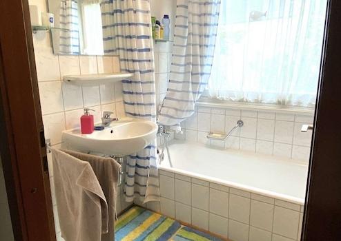 Der Boden ist hauptsächlich mit hellem Laminat ausgestattet. Im Badezimmer, in der Küche und im Gäste-WC wurden Fliesen an den Wänden verlegt, um vor Feuchtigkeit zu schützen. Das Bad ist vollständig ausgestattet mit Badewanne, WC und Waschbecken. Auch Ihre Küche ist vollständig ausgestattet mit allen Annehmlichkeiten, die Sie im Alltag benötigen.
