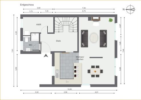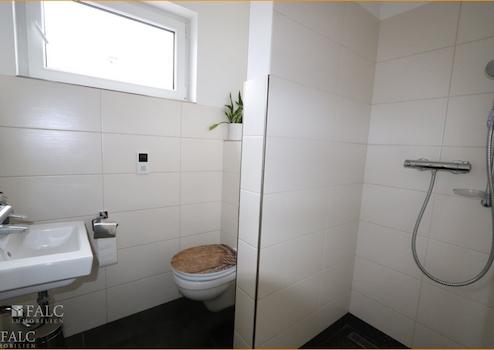 Neben einem Gäste-WC mit Dusche befindet sich im Erdgeschoss auch ein praktischer Hauswirtschaftsraum, der zusätzlichen Stauraum und Funktionalität bietet. Der Abstellraum unter der Treppe ist ideal für die Aufbewahrung der Garderobe und von Utensilien, die nicht tagtäglich benötigt werden.