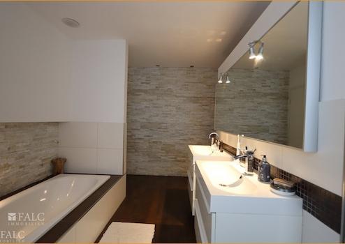 Die großzügige Badewanne im Masterbad, ist ein Ort der Entspannung und des Genusses. Hier können Sie in warmem Wasser versinken und den Tag hinter sich lassen. Die Größe der Wanne erlaubt es Ihnen, sich auszustrecken und den Alltagsstress zu vergessen. Die modernen Armaturen und die stilvolle Umgebung schaffen eine Atmosphäre, die zum Verweilen einlädt. Ein besonderes Highlight des Badezimmers ist das große Doppelwaschbecken für zwei Personen. Hier können Sie sich morgens gleichzeitig fertigmachen, ohne sich in die Quere zu kommen. Die großzügige Ablagefläche und die eleganten Waschbecken verleihen diesem Bereich einen Hauch von Luxus und Zweckmäßigkeit zugleich. Das WC mit Sichtschutz bietet Ihnen Privatsphäre und Komfort in einem stilvollen Rahmen. Und die gemauerte Dusche erzeugt das Gefühl, in einer Wellness-Oase zu stehen.