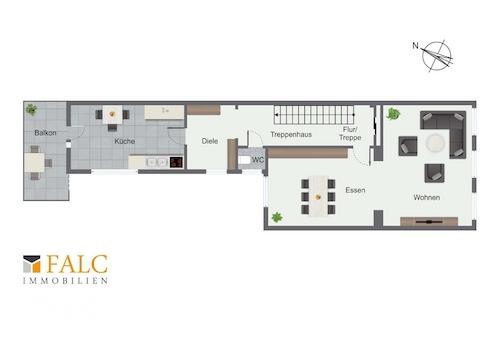 Die zweite Wohneinheit erstreckt sich über das erste und zweite Obergeschoss sowie das Dachgeschoss des Hauses und verfügt damit über rund 173m² Wohnfläche. Die Etage im ersten Obergeschoss bietet seinen Bewohnern einen ca. 42m² großen Wohn- und Essbereich, eine großzügige Wohnküche mit Zugang zum großen überdachten Balkon, ein Gäste-WC und eine geräumige Garderobendiele.