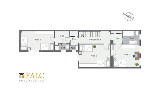 Im zweiten Obergeschoss befinden sich drei als Kinderzimmer genutzte Schlafräume, ein kleines Duschbad mit der Möglichkeit für ein separates WC und ein großes vollwertiges Bad mit Badewanne, WC und zwei Waschtischen.