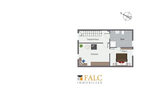 Im Dachgeschoss finden Sie neben dem Schlafzimmer und einem großem Arbeitszimmer noch ein weiteres geräumiges Badezimmer mit Dusche und WC.