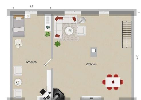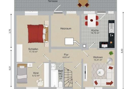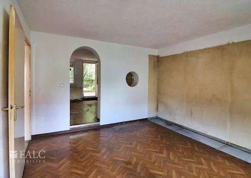 - Wohnbereich im Erdgeschoss (ca. 65 m², modernisierungsbedürftig) mit 3 Zimmern, Küche, Bad und Flur sowie Zugang zum Garten über die Terrasse und eine