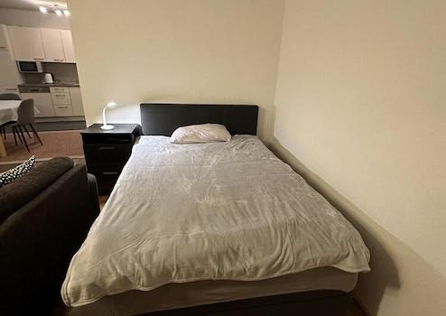 Das Apartment verfügt über einen großzügigen und offenen Wohn-/Schlafbereich, mit gemütlicher Couch, sowie einem Bett. Ein Schrank sorgt für genügend Stauraum.