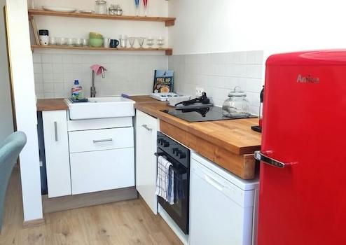 + Beim Eintreten stehst du in einer großzügigen Wohnküche mit gemütlichen Möbeln und neuen elektrischen Küchengeräten.