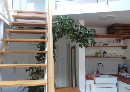 + In der oberen Etage befindet sich ein Schlafzimmer, ein Bad mit Badewanne und eine Galerie mit schöner Sitzecke.
