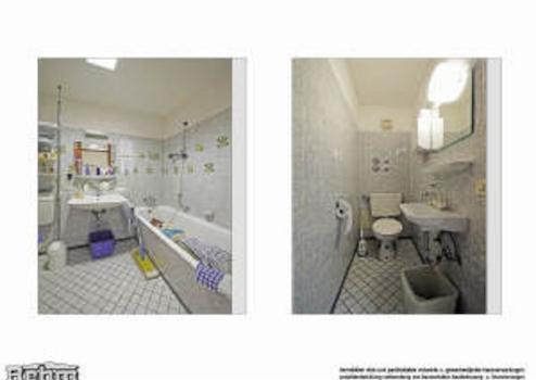 - Hell gefliestes Badezimmer mit Wanne, WC und Waschtisch