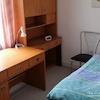 Schlafzimmer mit Bett 200x160 cm, Kleiderschrank, Schreibtisch mit Stuhl.