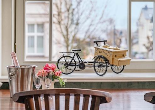 Du betrittst die Beletage und spürst sofort den Charme vergangener Zeiten – hohe Decken, ein Jugendstil-Kronleuchter über deiner Sofa-Lounge und ein Flatscreen-TV.