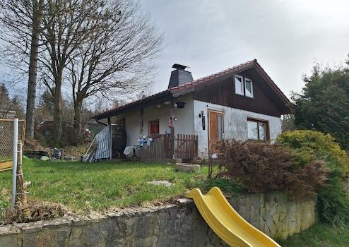sanierungsbedürftiges Wochenendhaus (Strom-, Wasser- u. Abwasseranschluss) beheizbar mit Ofen vom Keller (Warmluftschacht in EG u. OG)