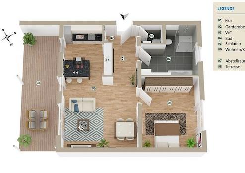- Die Böden in den Bädern werden gefliest, die übrigen Böden können nach Wunsch gestaltet werden.