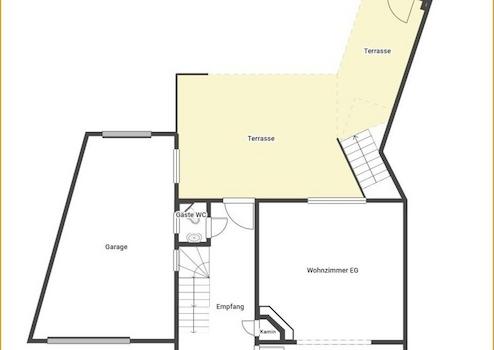 Vom Empfang gelangen Sie in die voll eingerichtete Küche und in das offen gestaltete Wohn-Esszimmer. Die beiden Räume können Sie, ebenso wie im ersten Obergeschoss mit geringem Aufwand voneinander trennen. Das Gäste WC in dieser Ebene liegt günstig neben der Terrassentüre der grossflächig überdachten Terrasse mit angrenzendem Garten und Garten-/Gerätehaus.