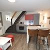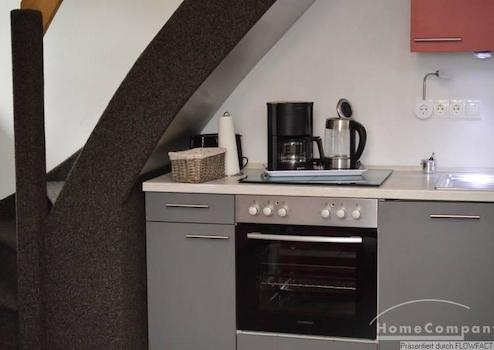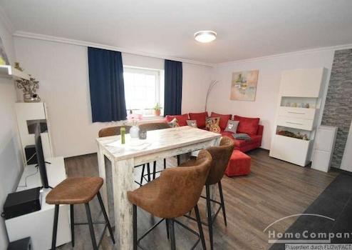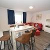 Diese Wohnung ist Teil einer gepflegten Anlage mit Gästezimmern und Ferienwohnungen. Die Wohnung ist sehr gemütlich eingerichtet und geht über 2 Etagen. Im Unteren Bereich befindet sich das moderne Duschbad und der Wohnbereich mit der integrierten voll ausgestalteten Küchenzeile. Zum Essen steht ein Tisch mit 4 Stühlen zur Verfügung. Eine gemütliche Couchgarnitur lädt zum Entspannen ein. Über eine Treppe gelangt man zu den beiden Schlafzimmern. Ein Schlafzimmer verfügt über ein Doppelbett, das andere Schlafzimmer hat 2 Einzelbetten. Die Wohnung ist perfekt für eine Familie oder 2 Kollegen.