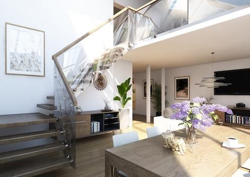 Wohnungen und Kellerräume sind schwellenfrei erreichbar, ebenfalls die Zugänge zu den Terrassen und Balkonen. Besonders komfortabel ist dabei eine offene Gestaltung der Grundrisse und Räume mit großen Fensterfronten, durch die eine warme, lichtdurchflutete Atmosphäre entsteht. Für ein ganz besonderes Flair sorgen die Erker mit dem Blick auf die stilvoll gestaltete Außenanlage. Die Größe der Wohnungen variiert von ca. 50 bis 121 qm und einer Anzahl von 1,5 bis 4 Zimmern. Teilweise erstrecken sich die Wohnungen über zwei Etagen und werden durch eine Treppe verbunden. Die attraktiven Penthouses in den Dachgeschossen entstanden durch eine behutsame Aufstockung des Bestandsgebäudes und geben dem Gesamtensemble eine ganz neue und frische Architekturansicht.