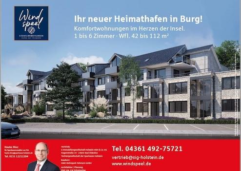 Nur drei Gehminuten entfernt bis zum historischen Marktplatz von Burg, dem Mittelpunkt der Insel, entsteht das Ensemble ”Windspeel” mit 25 Eigentumswohnungen. Das beschauliche Zentrum des kleinen Ortes ist bequem fußläufig erreichbar. Der attraktive Yachthafen sowie der bekannte Südstrand sind nur wenige Minuten mit dem Auto entfernt. Die Planung des Ensembles entstand unter anderem auch mit dem Ziel einer nachhaltigen Bauweise. Aus diesem Grund werden die Wohnungen im Erdgeschoss und in der ersten Etage im Bestand realisiert und ein Großteil der massiven bestehenden Gebäudesubstanz genutzt. Die Planung und Gestaltung aller Wohneinheiten entsteht unter Berücksichtigung von modernster Technik und einer hochwertigen Ausstattung mit namhaften Markenherstellern.