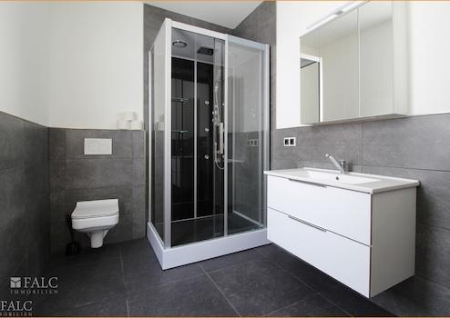 - geflieste Tageslicht-Badezimmer mit Wellness-Dusche, Waschtisch und WC