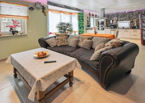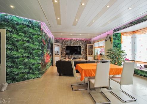 Hier wurde für einen spannenden Kinoabend ein Soundsystem sowie eine indirekte Beleuchtung verbaut. Durch die Terrassentür im Küchenbereich können Sie Ihre Mahlzeiten mit einem wundervollen Blick ins Grüne genießen.