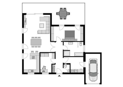 Der elegante Hausentwurf des Winkelbungalows mit Walmdach, überdachter Terrasse und Garage hat einiges zu bieten. Der offen angelegte Wohn-/Ess- und Kochbereich bietet viel Platz und ist mit einer Panorama-Hebeschiebetür, drei Terrassentüren und einem Fenster von Tageslicht durchflutet.