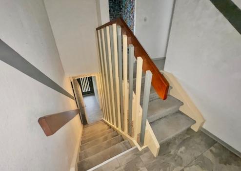 Die Küche ist mit einer zeitlosen Einbauküche ausgestattet. Zusätzliches Tageslicht gelangt neben der bodentiefen Fensterfront des Wohnzimmers, die sich über die gesamte Hausbreite erstreckt, über ein Oberlicht hinein, das im Flachdach des Hauses platziert ist. Das Dach wurde im Jahr 2013 fachmännisch saniert und gedämmt. Das Wohnzimmer erlaubt einen Blick in den tiefen Garten, der am Ende mit einem Gerätehaus versehen ist. Zurück im Flur führt eine Treppe in den Keller des Hauses, der Ihren Gästen einen Aufenthalt über Nacht oder das Arbeiten im Homeoffice ermöglicht. Zudem steht noch ein Vorratsraum sowie eine Waschküche zur Verfügung. Die Waschküche beherbergt die im Jahr 2012 neu installierte Gas-Zentralheizung. Das Dachgeschoss ohne Schrägen kann beispielsweise von zwei Kindern bewohnt werden. Hier steht neben den beiden Kinderzimmern ein Duschabd mit WC zur Verfügung, das über ein Fenster belüftet wird. Die doppelt isolierten Fenster des Hauses sind aus Kunststoff gefertigt und wurden 2019/ 2022 installiert. Alle Außenjalousien in den Schlafzimmern sowie im Wohnzimmer werden elektrisch betrieben.