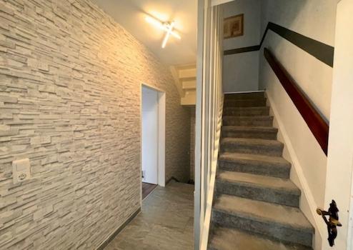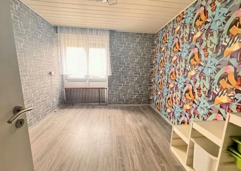 Die Küche ist mit einer zeitlosen Einbauküche ausgestattet. Zusätzliches Tageslicht gelangt neben der bodentiefen Fensterfront des Wohnzimmers, die sich über die gesamte Hausbreite erstreckt, über ein Oberlicht hinein, das im Flachdach des Hauses platziert ist. Das Dach wurde im Jahr 2013 fachmännisch saniert und gedämmt. Das Wohnzimmer erlaubt einen Blick in den tiefen Garten, der am Ende mit einem Gerätehaus versehen ist. Zurück im Flur führt eine Treppe in den Keller des Hauses, der Ihren Gästen einen Aufenthalt über Nacht oder das Arbeiten im Homeoffice ermöglicht. Zudem steht noch ein Vorratsraum sowie eine Waschküche zur Verfügung. Die Waschküche beherbergt die im Jahr 2012 neu installierte Gas-Zentralheizung. Das Dachgeschoss ohne Schrägen kann beispielsweise von zwei Kindern bewohnt werden. Hier steht neben den beiden Kinderzimmern ein Duschabd mit WC zur Verfügung, das über ein Fenster belüftet wird. Die doppelt isolierten Fenster des Hauses sind aus Kunststoff gefertigt und wurden 2019/ 2022 installiert. Alle Außenjalousien in den Schlafzimmern sowie im Wohnzimmer werden elektrisch betrieben.