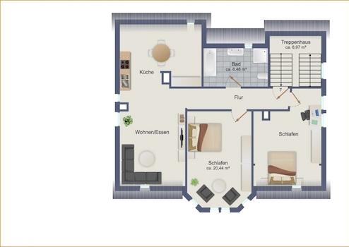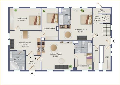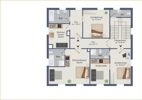 In der Konzeptplanung wurden vom Architekten für das Erdgeschoss drei Apartments durchdacht geplant. Im 1. Obergeschoss sind drei weitere gut geschnittene Apartments mit Badezimmer und Küche vorgesehen und im Dachgeschoss ein großes Apartment mit 2 separaten Schlafzimmern, großzügigem Wohn-Essbereich und Badezimmer.