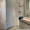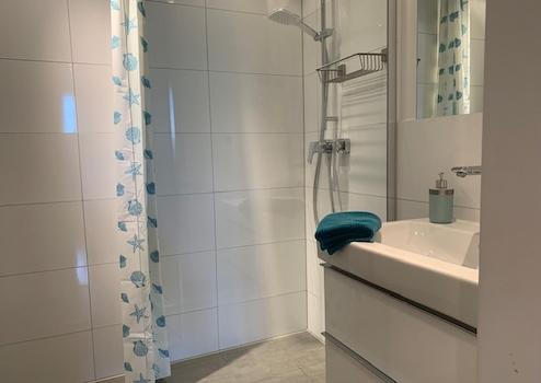 Weiß gefliestes Duschbad mit betongrauen Bodenfliesen,