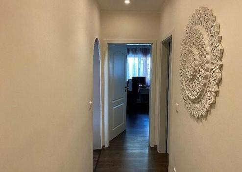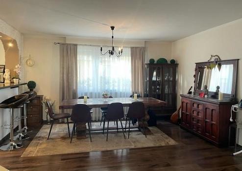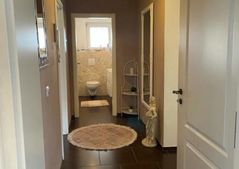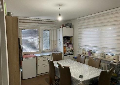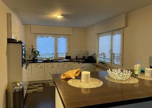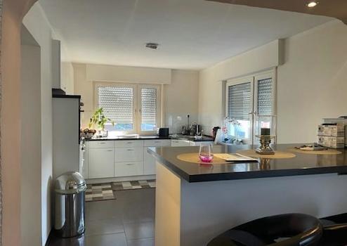 Nachdem Sie nun das Haus betreten haben, stehen Sie im Eingangsbereich der ersten und zugleich größten Wohnung. Auf ihren insgesamt 180m², die sich bis in den Kellerbereich erstrecken, befinden sich eine große, sowie praktisch und zum EZi offen gestaltete Küche.