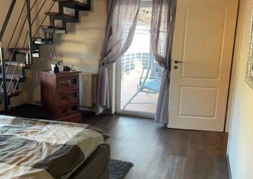 Nun gelangen Sie, wieder über die Treppe, in das Obergeschoss. Hier befindet sich die zweite Wohnung. Auf ihren ca. 90m² beherbergt sie eine Küche mit integriertem Essbereich, ein gemütliches Wohnzimmer, ein Tageslichtbad mit Badewanne und Anschluss für die Waschmaschine, sowie zwei Schlafzimmer mit Ausgang zum Balkon - auf dem Sie den Sonnenuntergang genießen können.