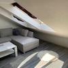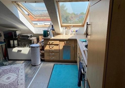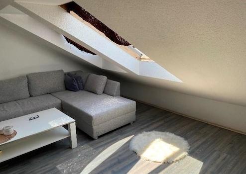 Als Letztes möchte ich Ihnen die Wohnung im Dachgeschoss, mit ihren 50m² zeigen. Diese beherbergt eine Küche mit Essbereich, ein Tageslichtbad mit Dusche und ein Wohnzimmer mit abgetrenntem Schlafbereich.