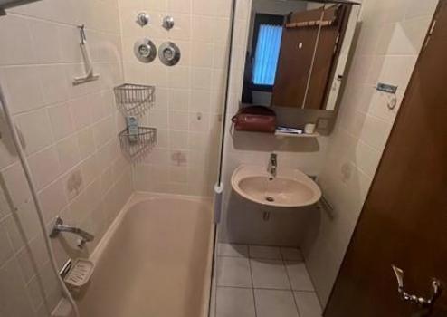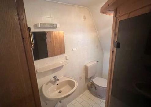 Links neben dem Eingang finden Sie das Gäste-WC und dem Flur folgend erreichen Sie das große Bad mit Wanne.