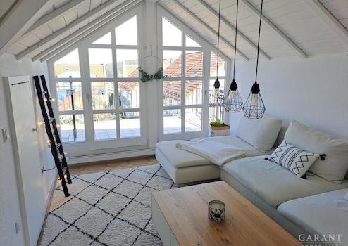 Dachbalkon mit Blick über die Dächer von Biberach, moderner Wohnküche, Bad und drei Zimmer