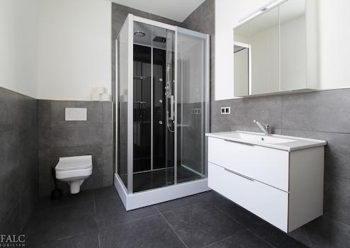 - geflieste Tageslicht-Badezimmer mit Wellness-Dusche, Waschtisch und WC