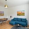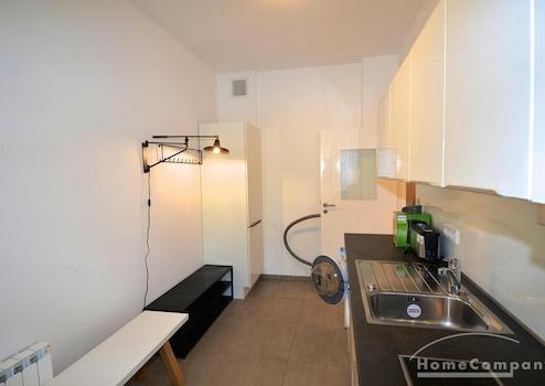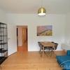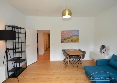 Schöne Zwei-Zimmer-Wohnung in der Nähe des Parks Rehberge in Berlin. Die Wohnung ist möbliert und verfügt über ein Schlafzimmer und ein Wohnzimmer. Waschmaschine und Geschirrspüler sind vorhanden. Im Wohnzimmer gibt es einen Essbereich und ein großes, gemütliches Sofa. Die Küche ist sehr geräumig und bietet einen weiteren, kleinen Esstisch.