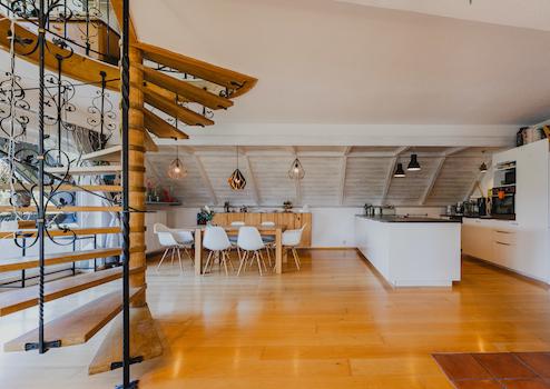 Diese außergewöhnliche Maisonette – Wohnung wurde in den letzten Jahren vom Eigentümer mit Hilfe einer Innenarchitektin umgestaltet, es wurden die Fußbodenbeläge erneuert, die Räumlichkeiten großzügig umgestaltet, die Bäder vergrößert und erneuert. Der Wohnraum mit der integrierten Küche, dem Kaminofen und der Treppe in der Mitte des Raumes ins Obergeschoss ist eine Augenweide. Unterstützt wird dieses Gefühl noch von dem grandiosen Blick auf das Brauneck im Westen. Vom Obergeschoss aus können Sie vom Balkon aus nach Osten die Aussicht genießen. Im Obergeschoss ist eine Klimaanlage installiert um in den Sommermonaten die Raumtemperatur angenehm zu gestalten.