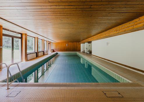 Im Untergeschoss befindet sich ein großes Schwimmbad mit Sauna und ein Fitnessraum. Von dieser Ebene gibt es einen direkten Ausgang zur Liegewiese.