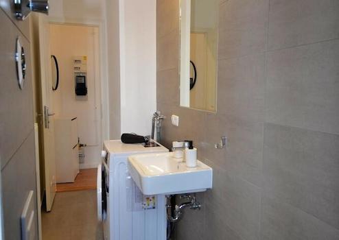 Ein-Zimmer-Wohnung in Wedding. Vollständig möbliert mit Bett, Tisch und Waschmaschine. Modern gefliestes Badezimmer mit Wanne. Viel Stauraum bietet der große Flur.