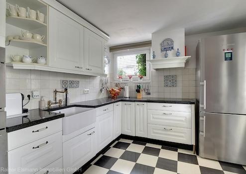 Die Einbauküche mit elektrischen Geräten bleibt im Objekt, es bietet sich genügend Platz für einen kleinen Esstisch. Durch die Tür zur Terrasse können Sie bequem im Freien speisen und den Blick auf den Garten genießen.